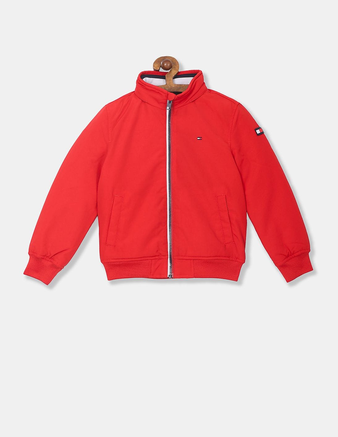 Boys Red High Neck Zip-Up Solid Bomber Jacket