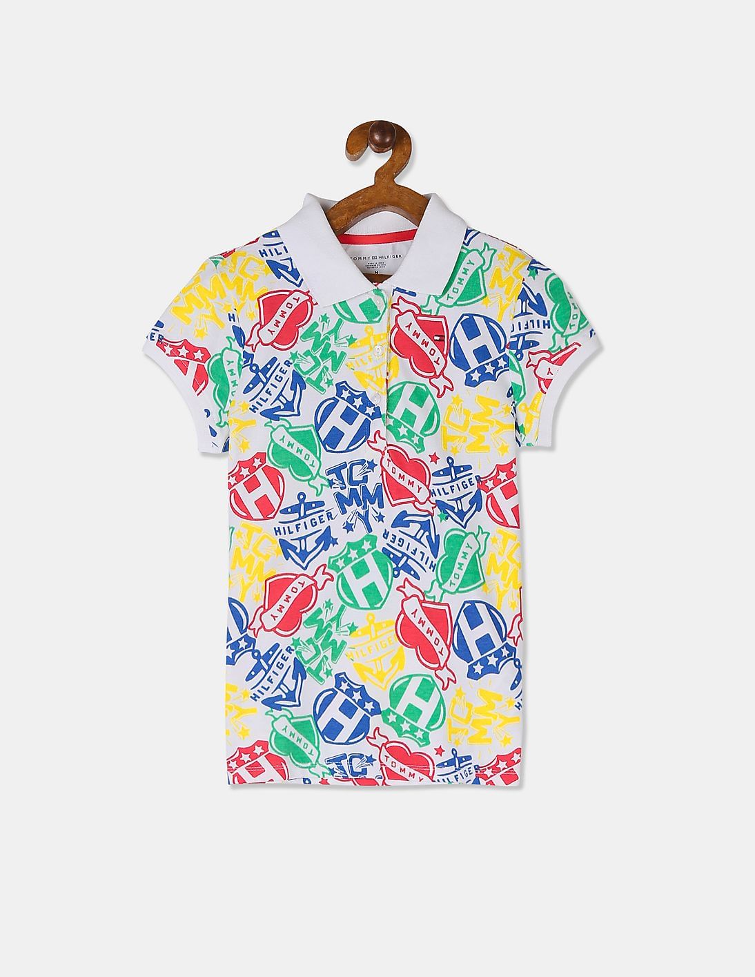 Girls Multi Colour Short Sleeve Retro Printed Polo Shirt