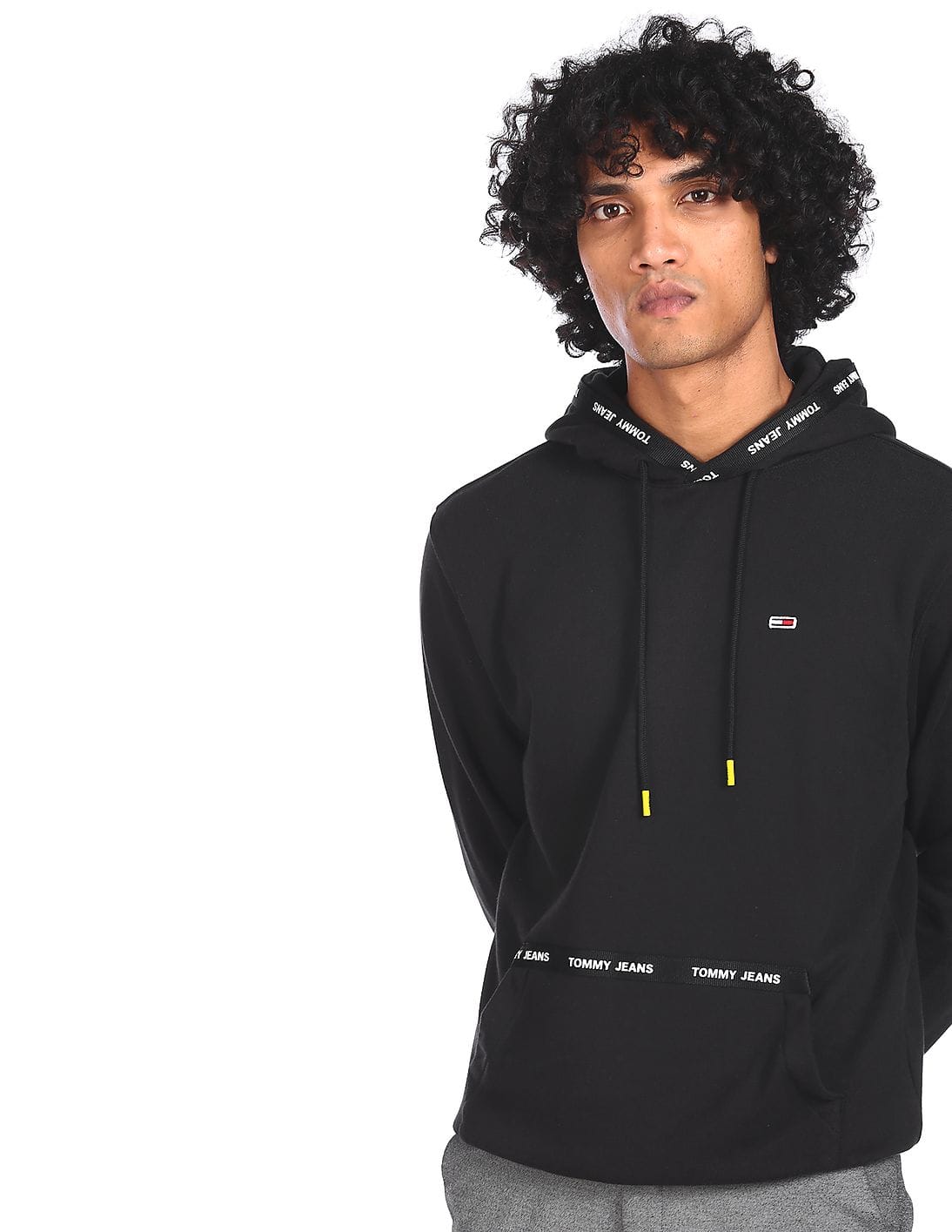 Men Black Branded Tape Drawstring Hood Sweatshirt