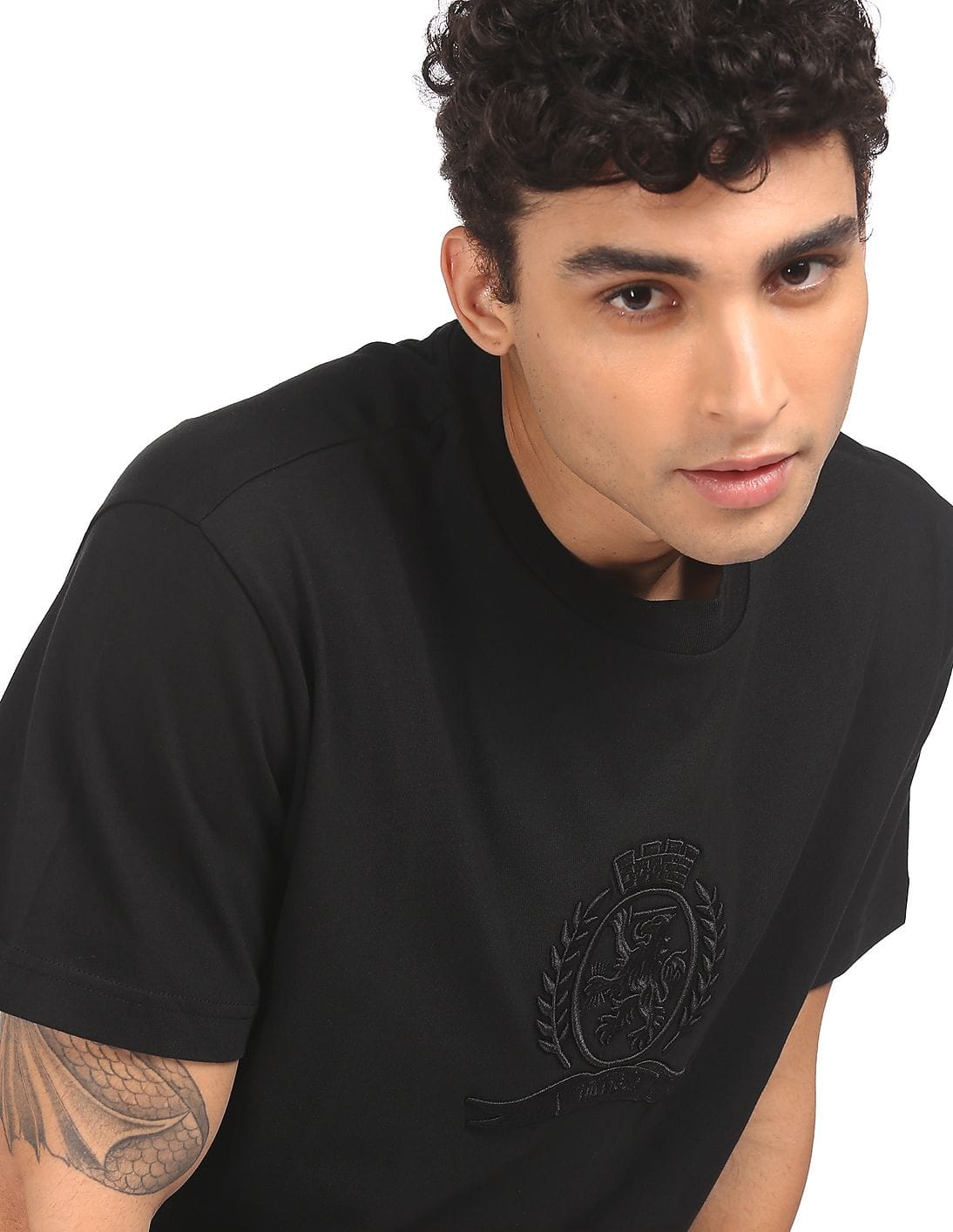 Men Black Crew Neck Tonal Crest Logo T-Shirt
