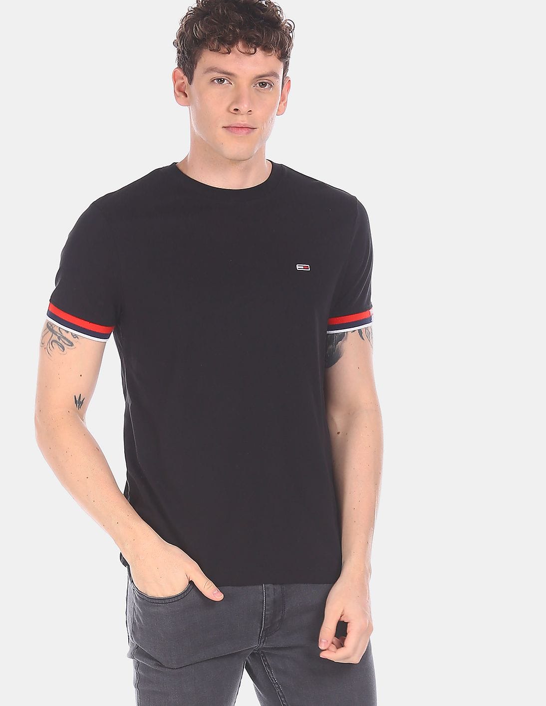 Men Black Ribbed Crew Neck Solid T-Shirt