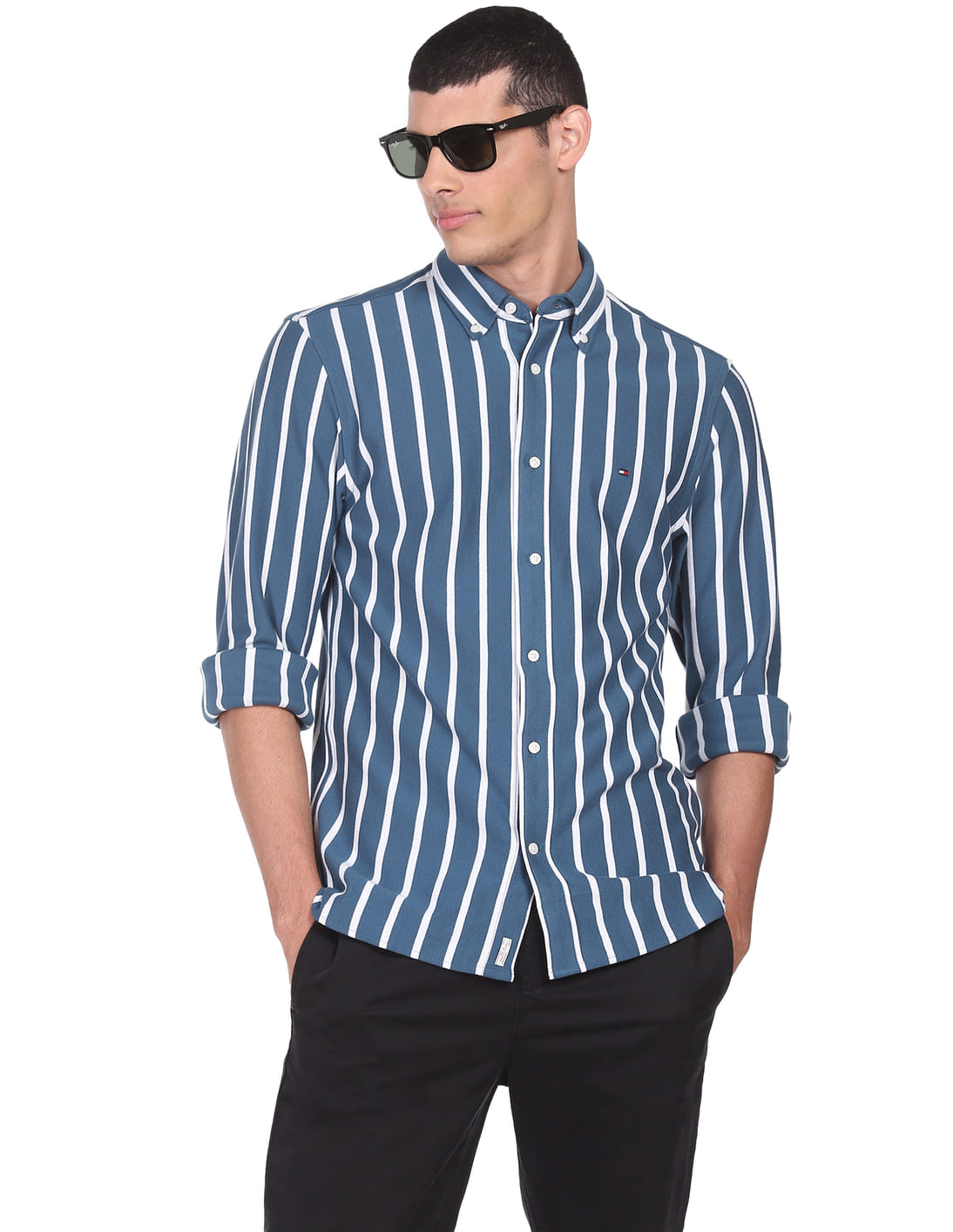 Men Blue And White Vertical Stripe Knit Casual Shirt