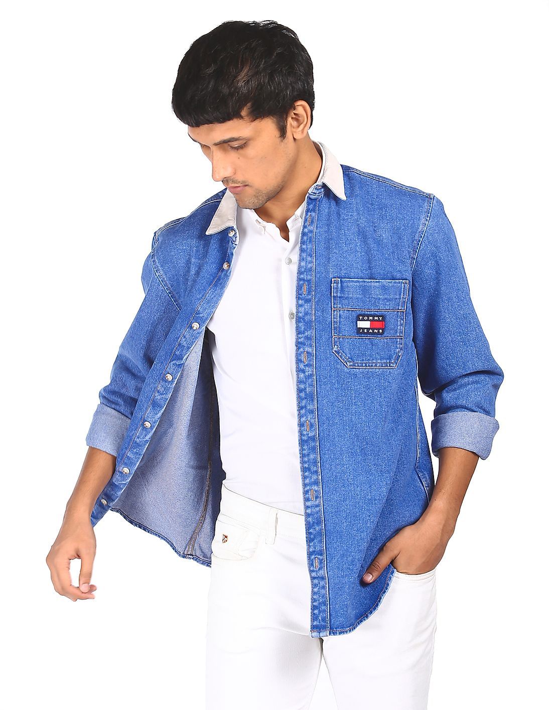 Men Blue Contrast Spread Collar Denim Washed Shirt