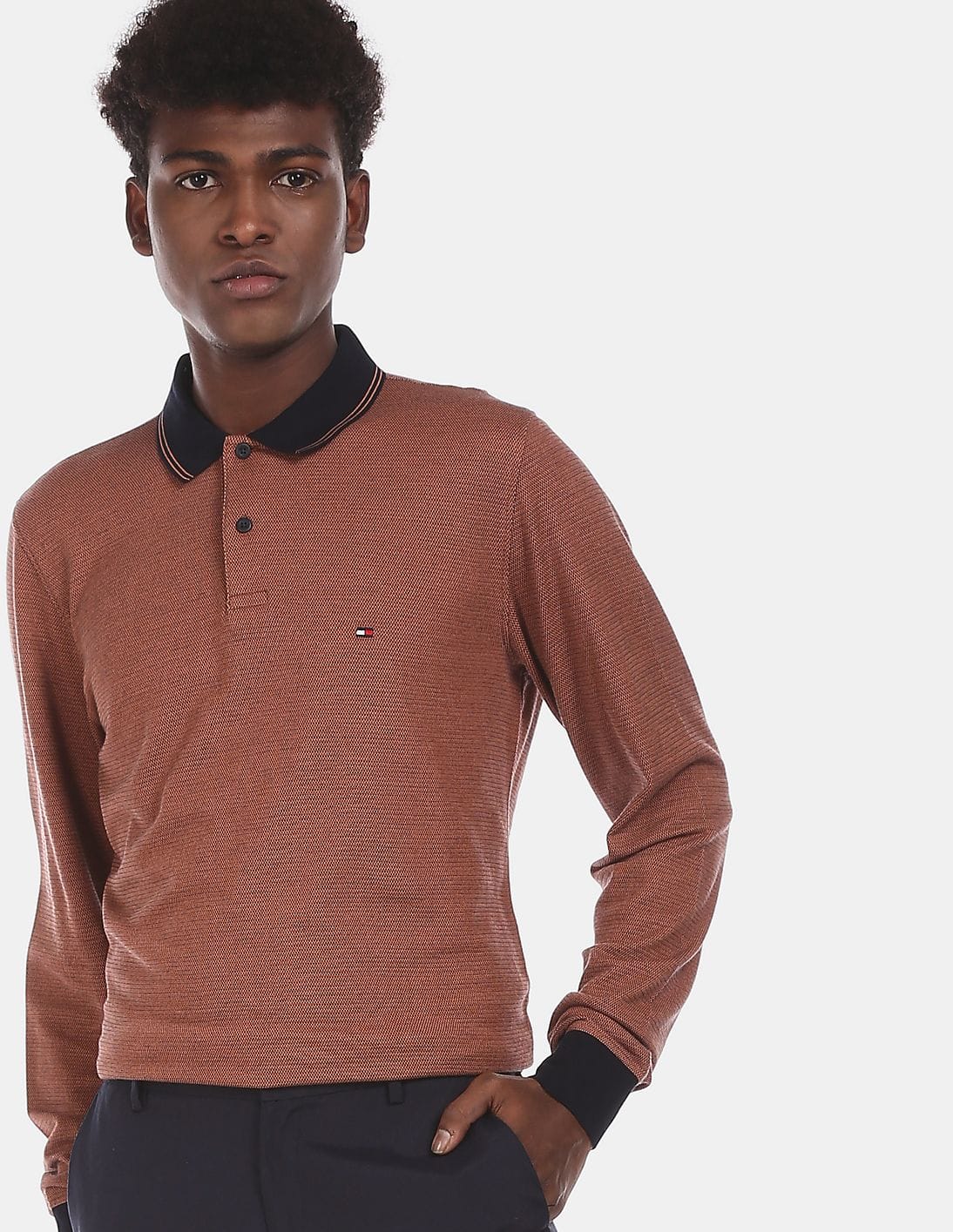 Men Brown Long Sleeve Jacquard Patterned Knit Polo Shirt