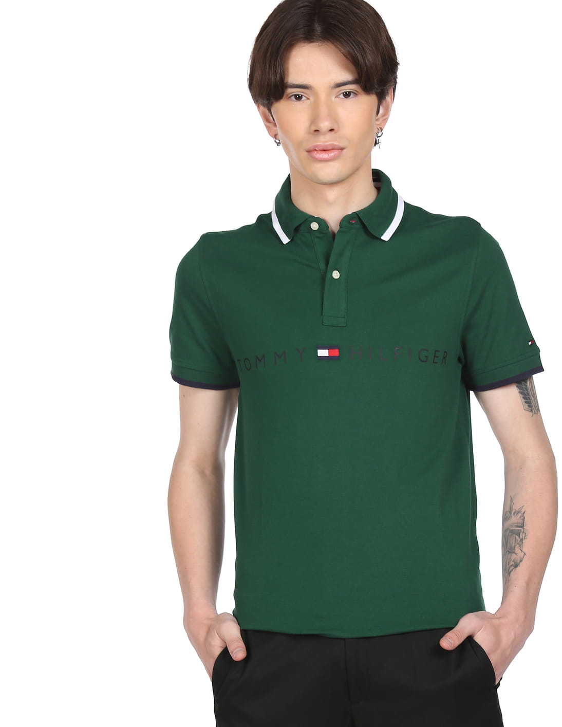 Men Dark Green Tipped Collar Logo Polo Shirt