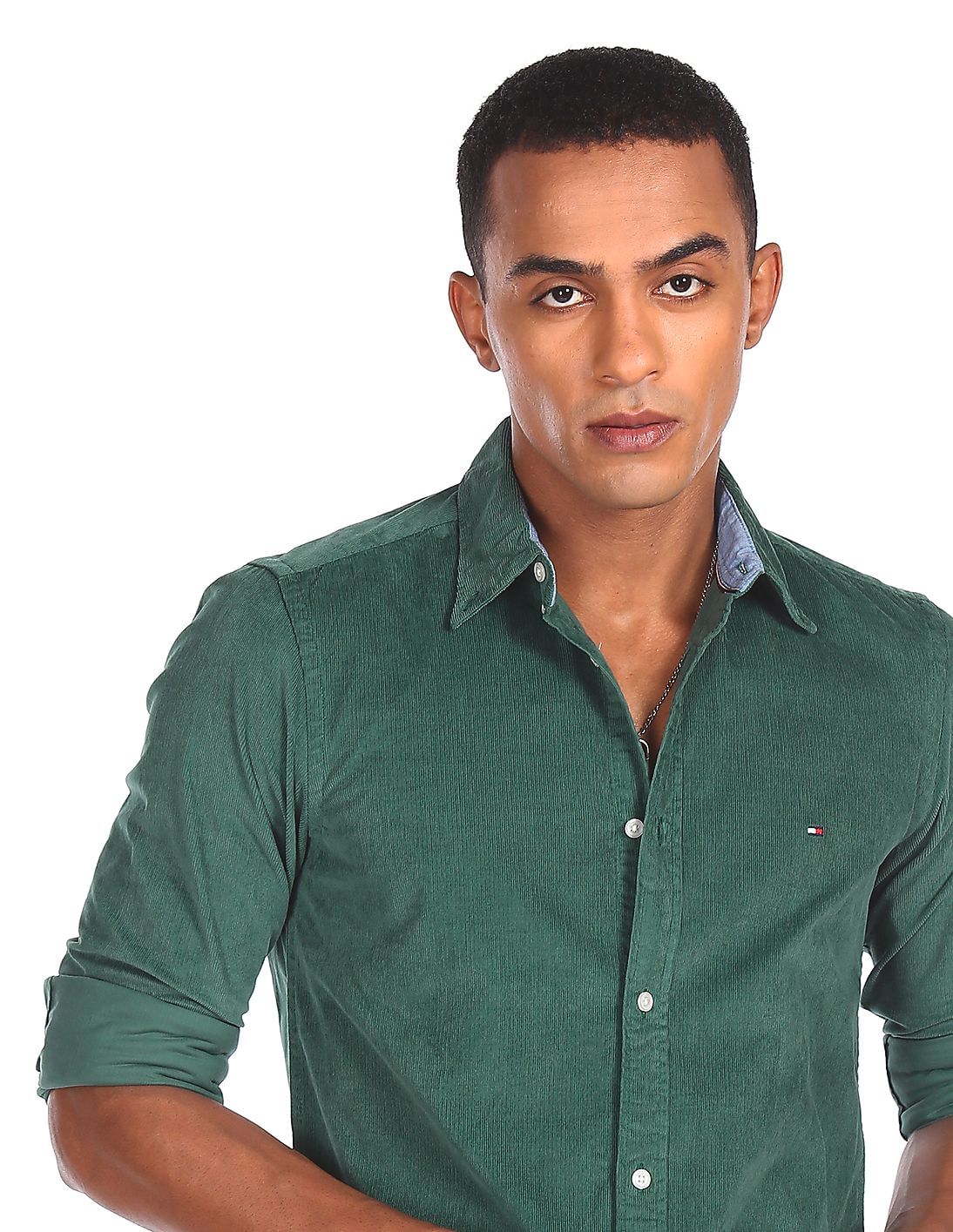 Men Green Slim Fit Flex Corduroy Casual Shirt