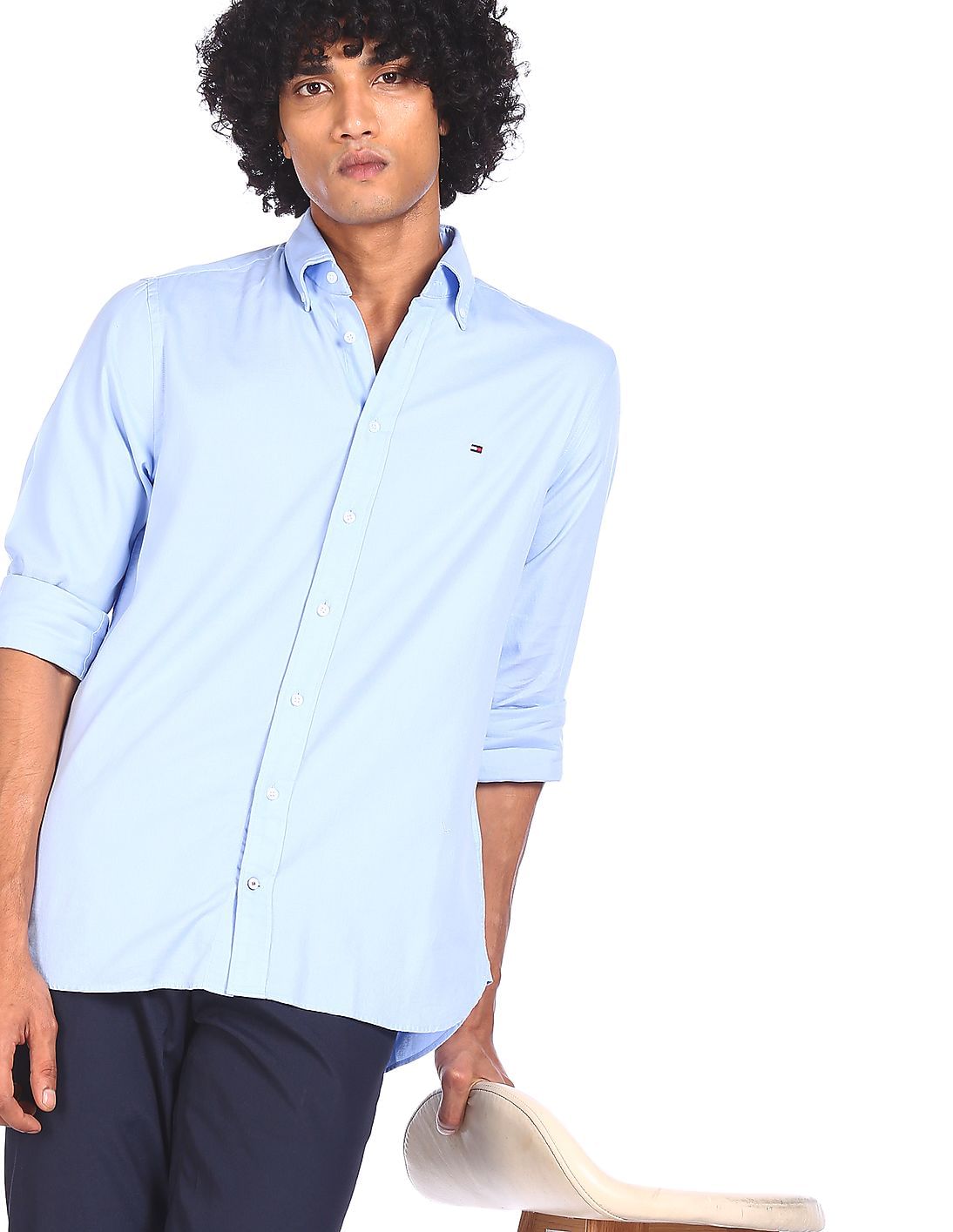 Men Light Blue Button Down Collar Solid Casual Shirt