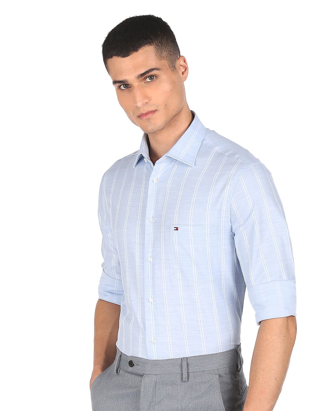 Men Light Blue Spread Collar Striped Heathered Smart Casual Shirt