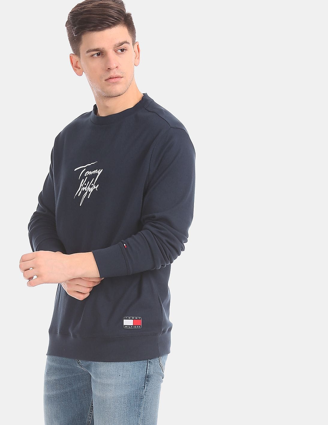 Men Blue Long Sleeve Crew Neck Brand Print T-Shirt