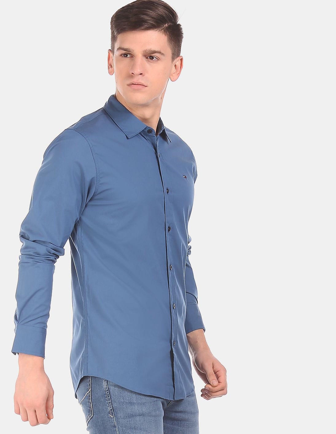 Men Blue Long Sleeve Solid Slim Fit Shirt