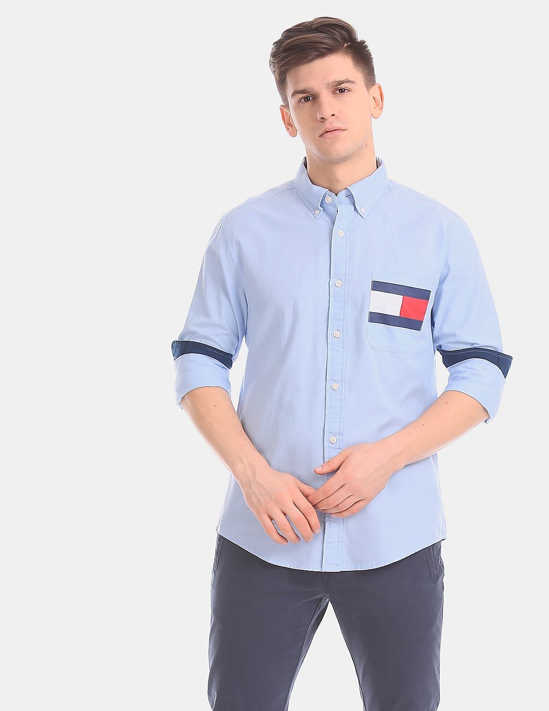 Men Blue Patch Pocket Button Down Collar Oxford Casual Shirt