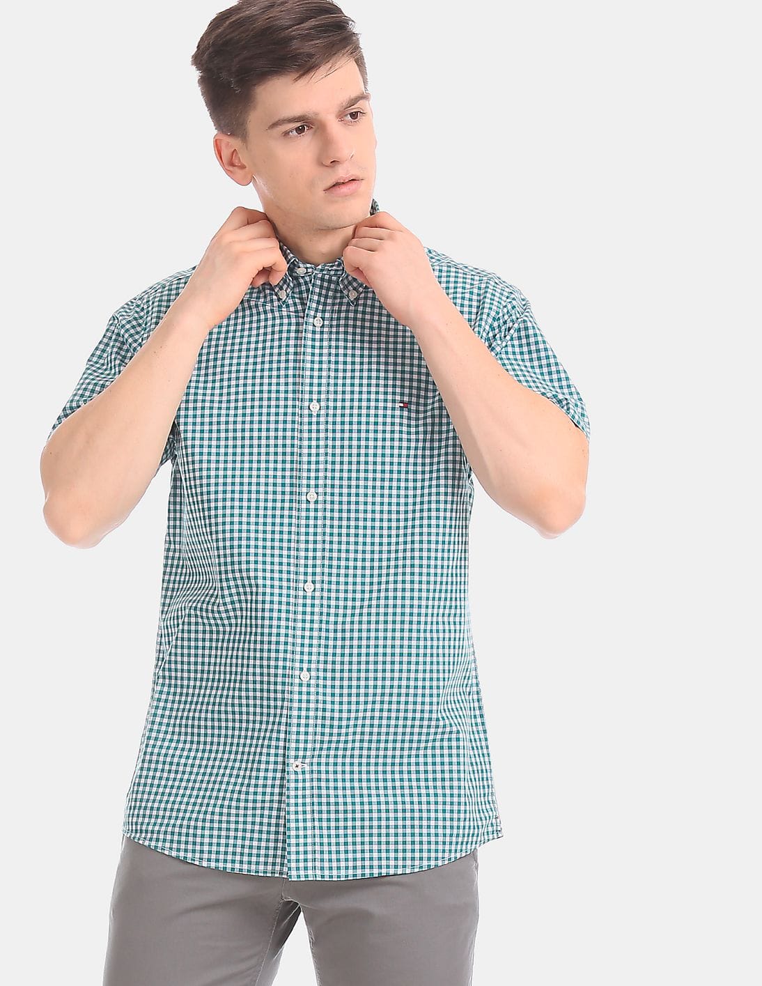 Men Green And White Short Sleeve Gingham Check Casual Shirt