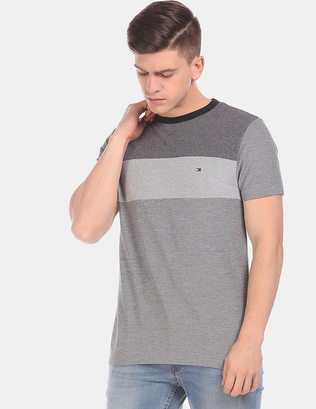 Men Grey And Black Round Neck Texture Color Blocked Short Sleeve T-Shirt