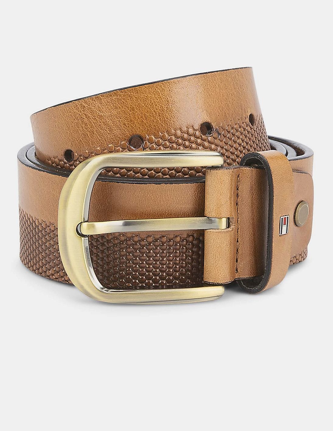 Men Tan Half Perforated Side Strap Basic Leather Belt