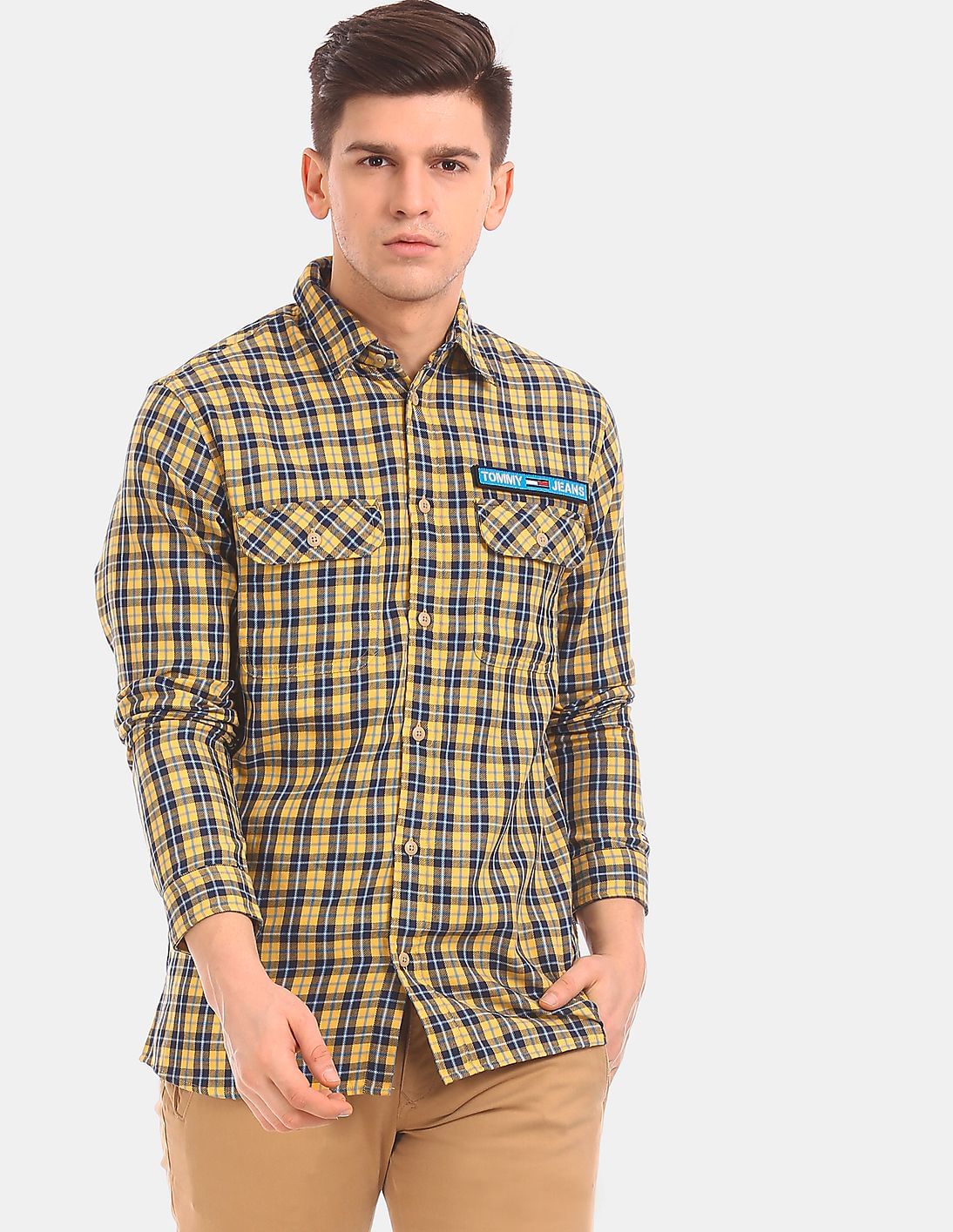 Men Yellow Flap Pocket Check Cotton Casual Shirt