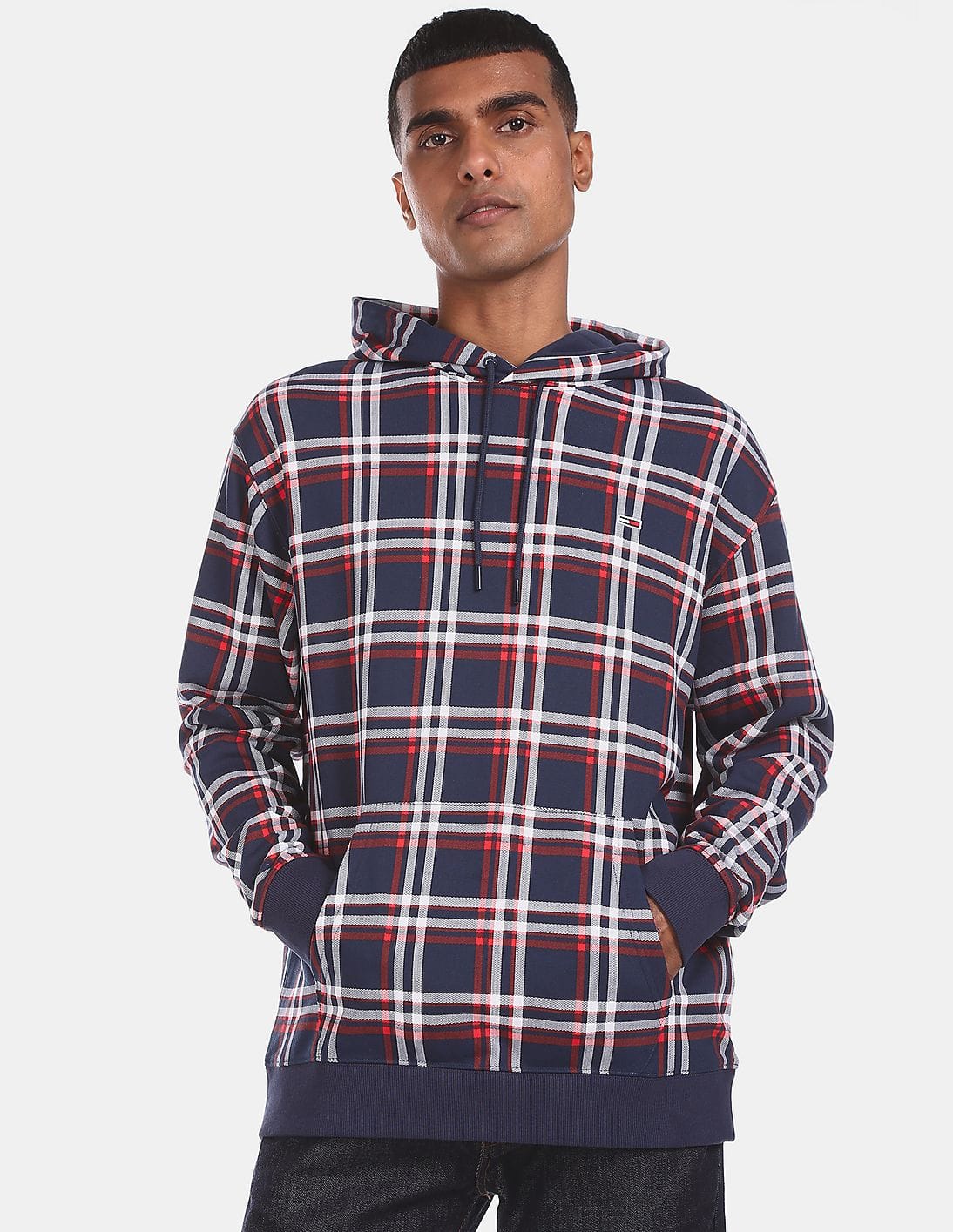 Men Navy All Over Plaid Hooded Sweatshirt