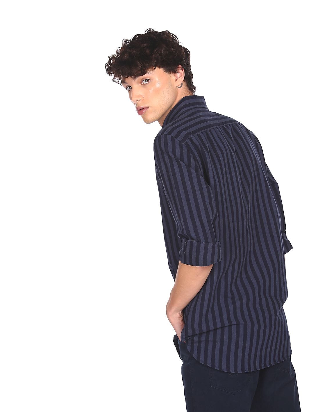 Men Navy Spread Collar Flannel Stripe Casual Shirt
