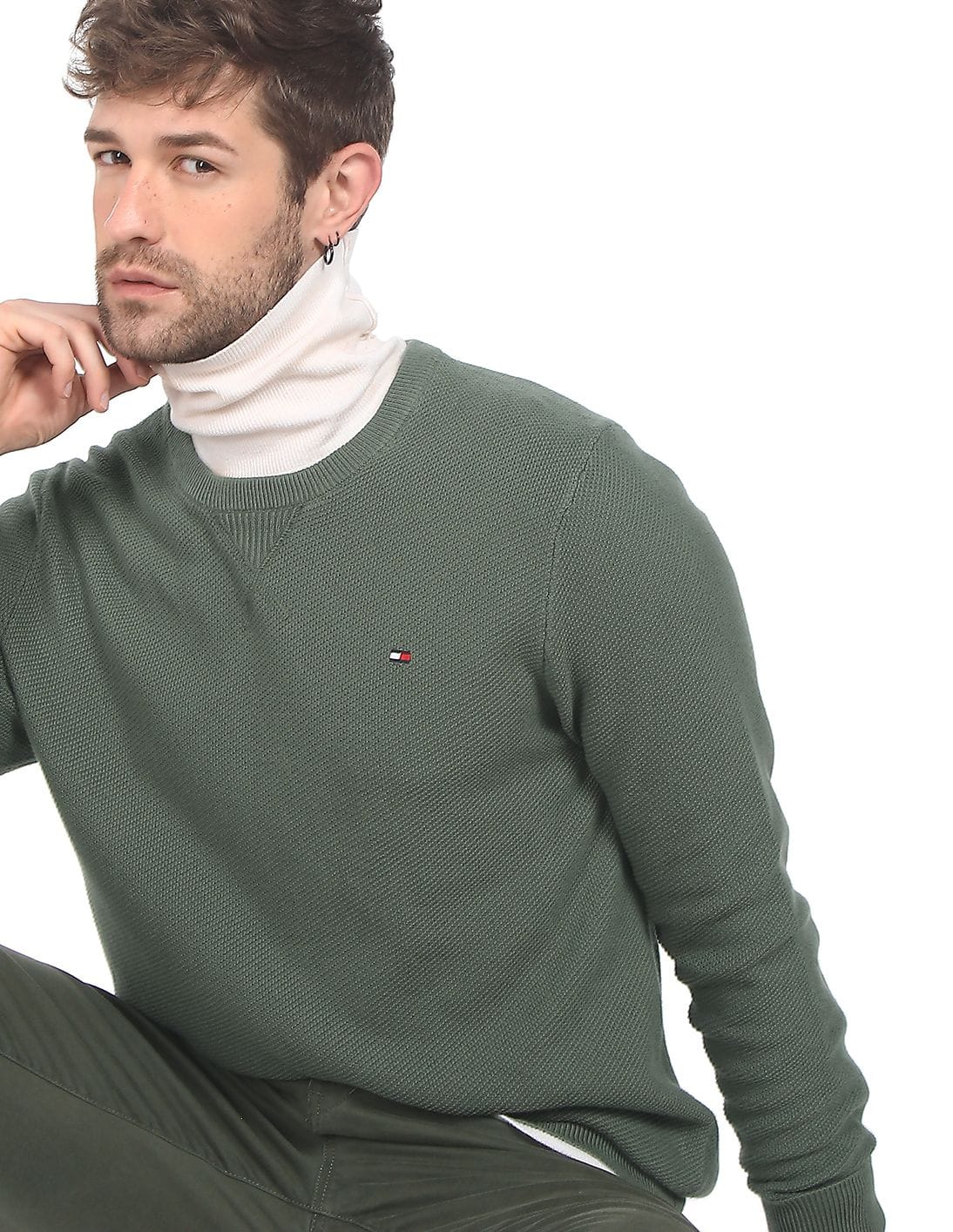 Men Olive Crew Neck Textured Sweater