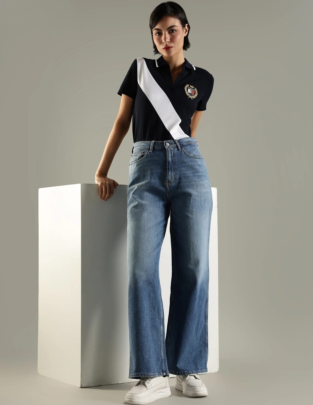 Mid-Wash Wide Leg Fit Mid Rise Jeans