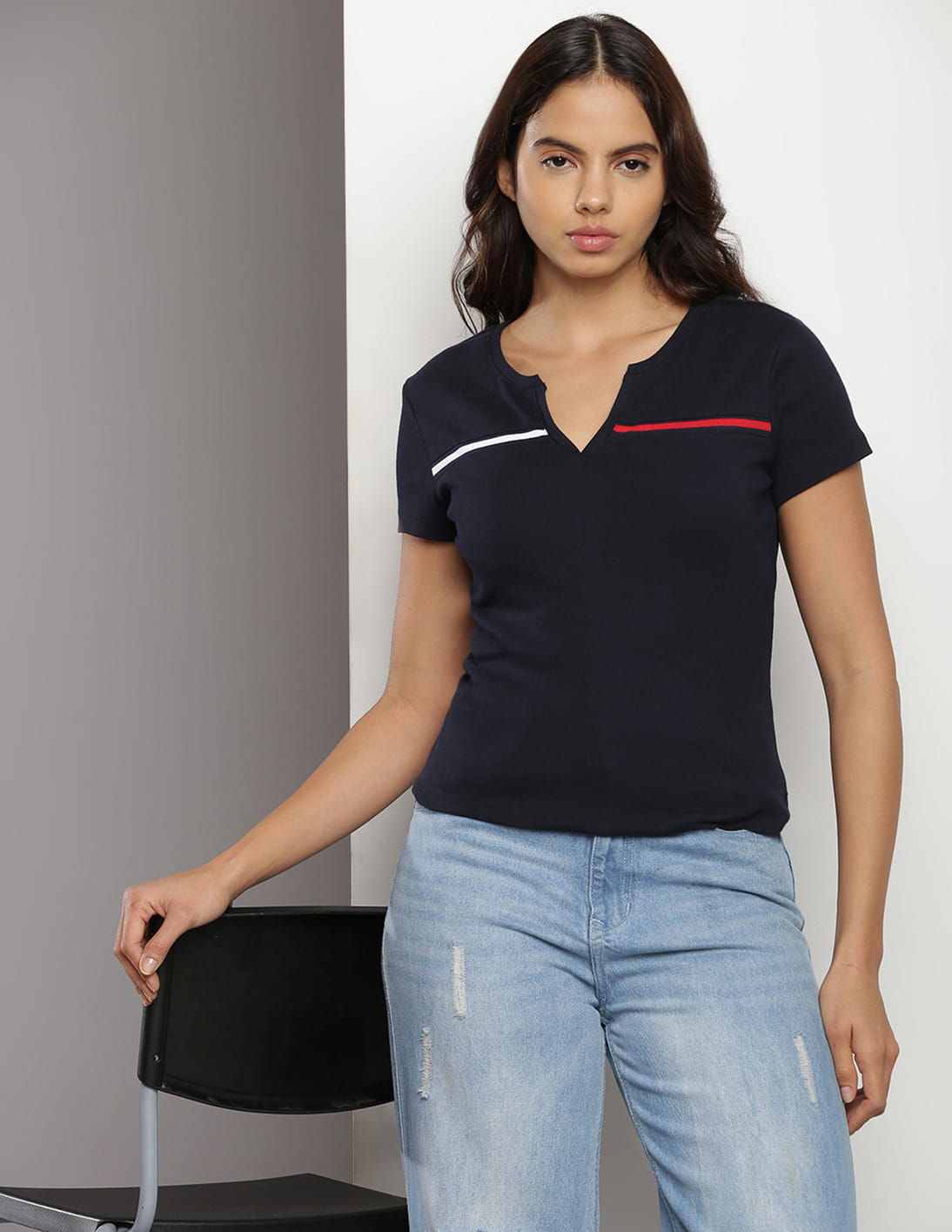Notch Neck Brand Stripe T-Shirt