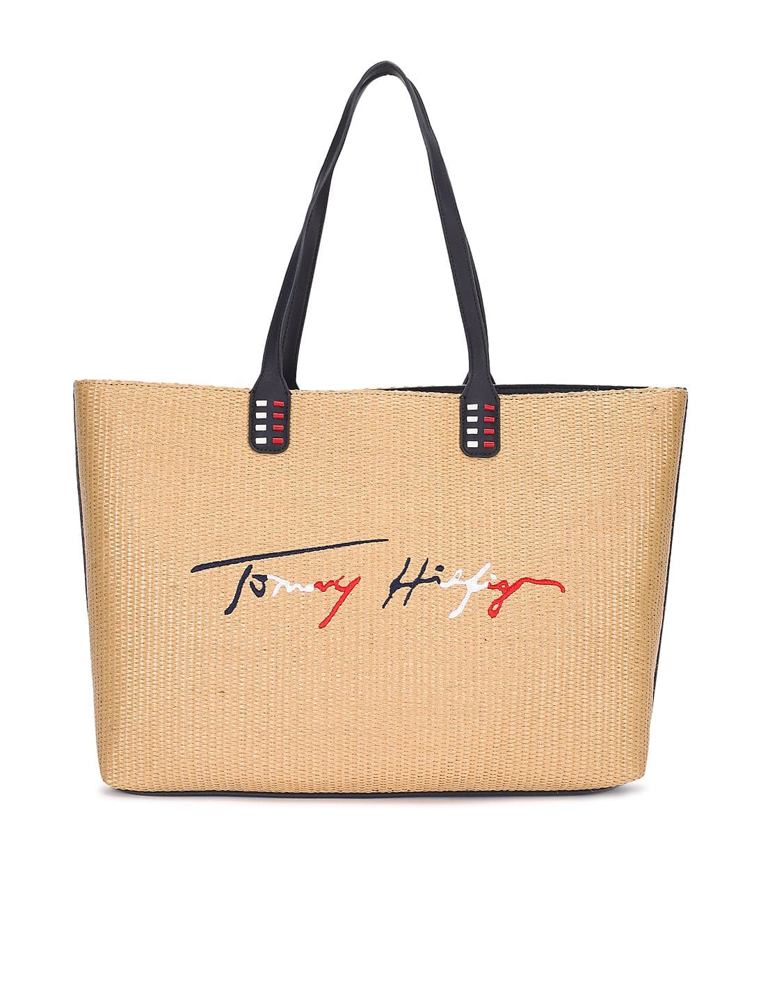 Women Beige Embroidered Logo Textured Straw Tote Bag