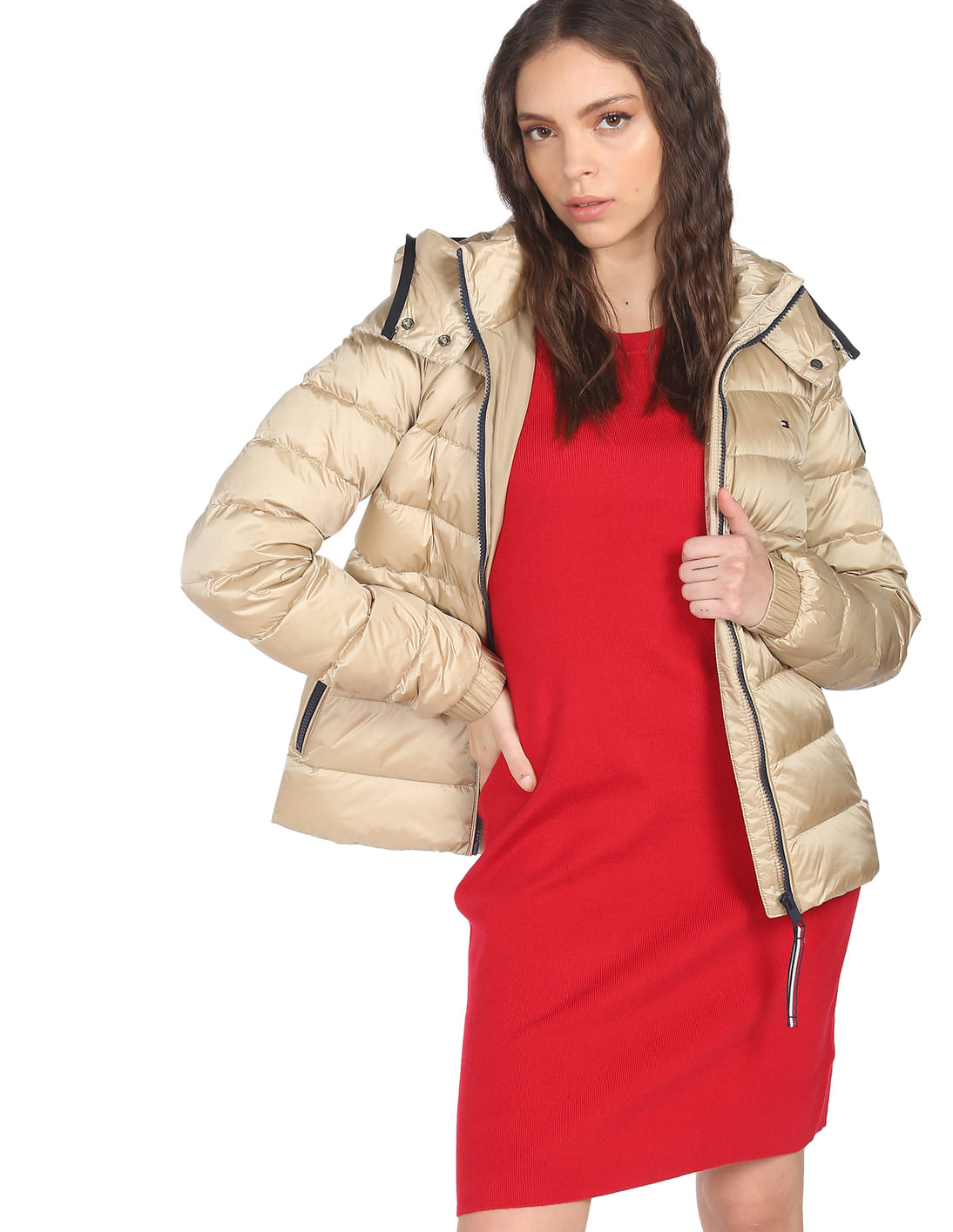Women Beige Light Weight Brand Tape Hooded Quilted Jacket