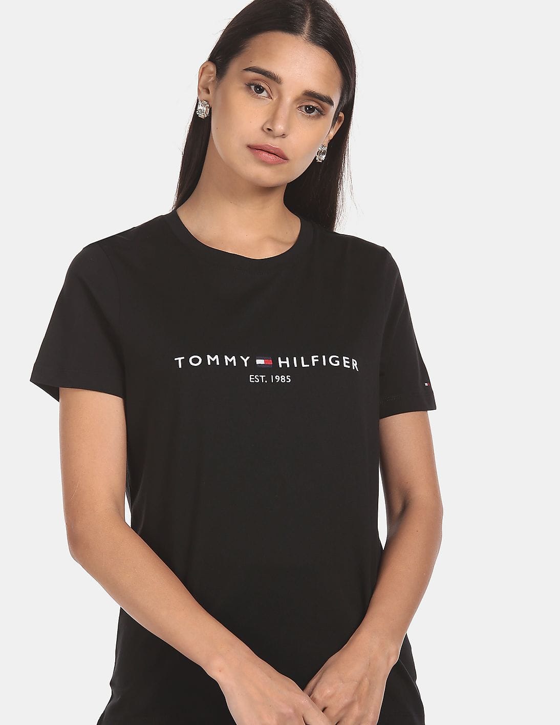 Women Black Crew Neck Embroidered Logo T-Shirt