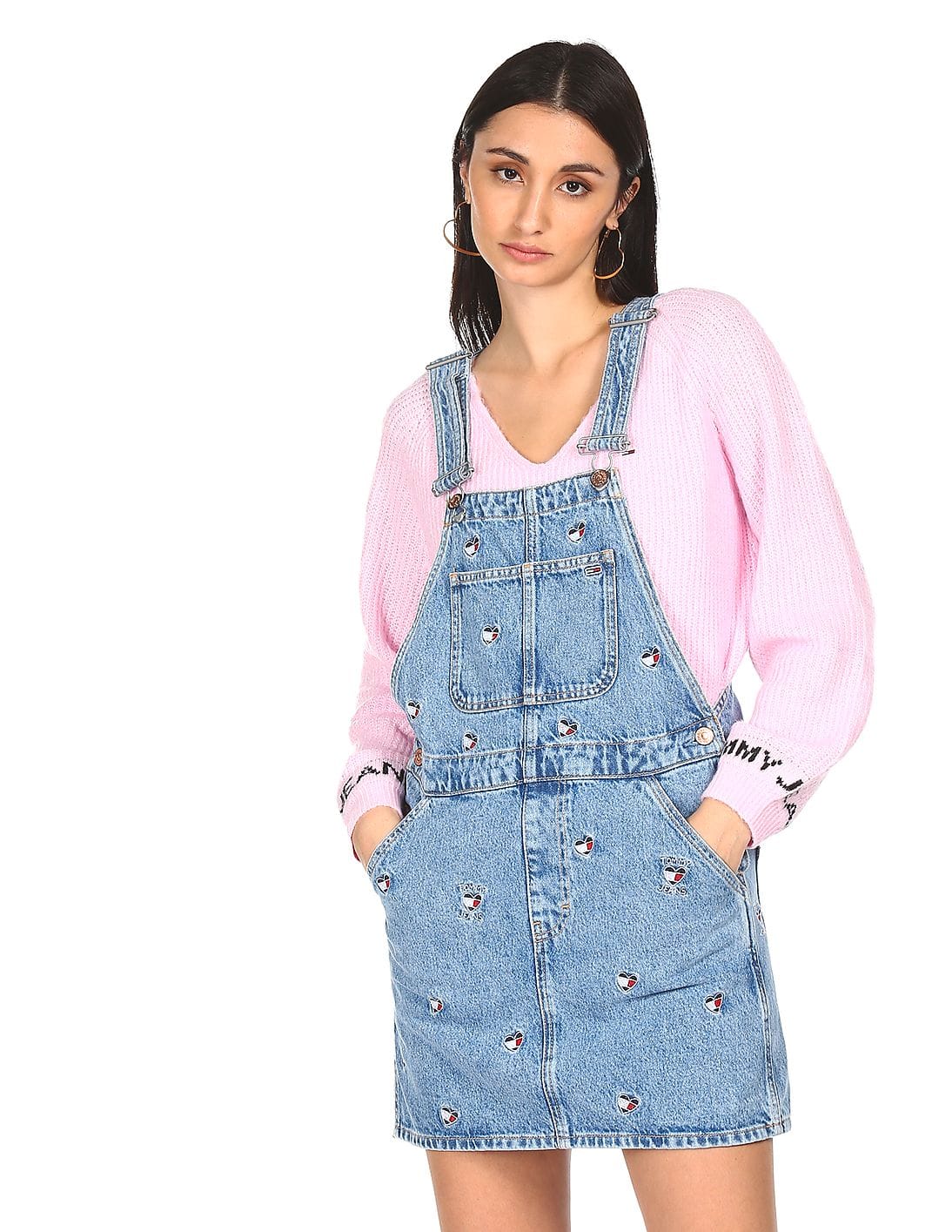 Women Blue Square Neck Embroidered Dungaree Dress