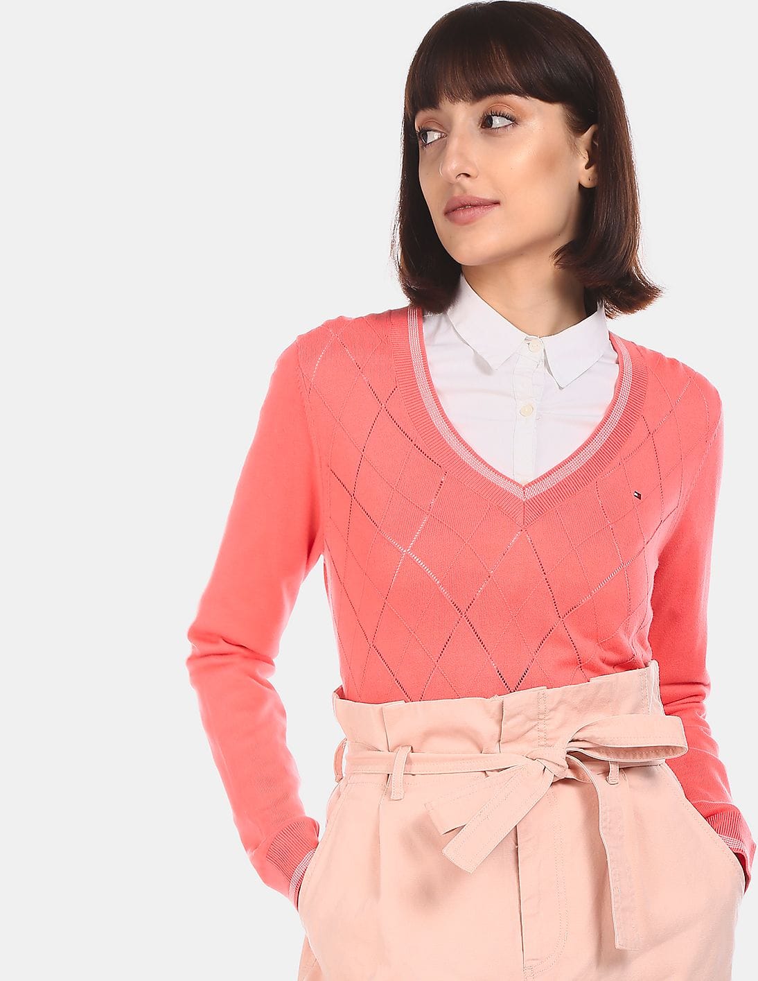 Women Coral Pink Ribbed V-Neck Pointelle Knit Sweater