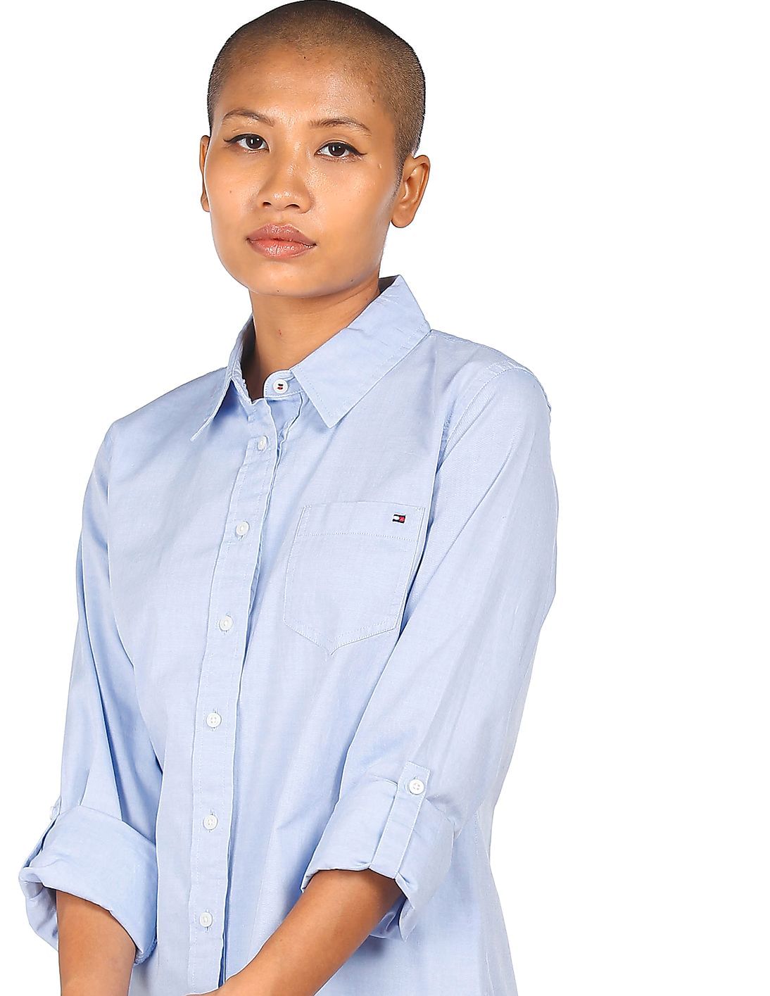 Women Light Blue Spread Collar Solid Oxford Shirt