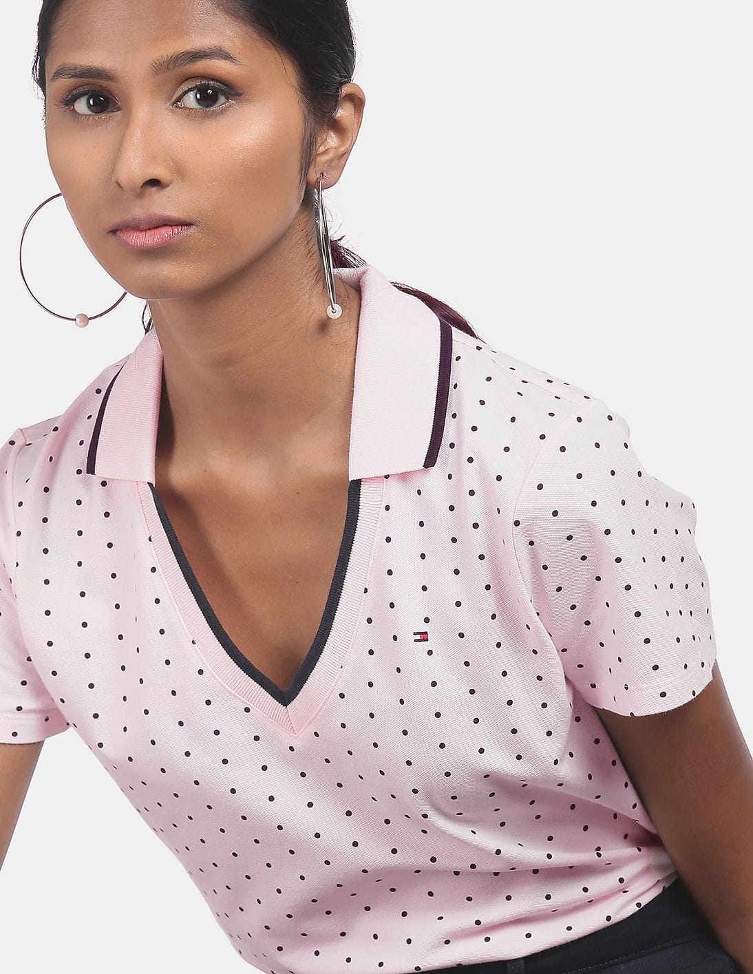 Women Light Pink Polka Dot Print Pique Polo Shirt