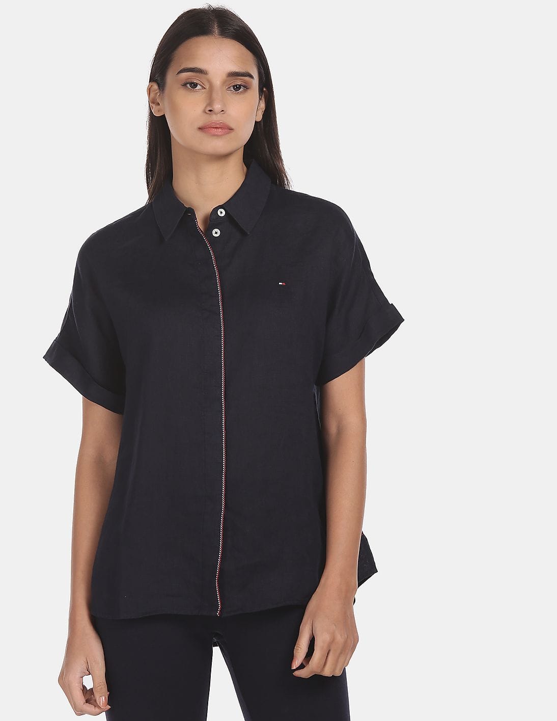 Women Navy Alisa Relaxed Fit Solid Linen Casual Shirt