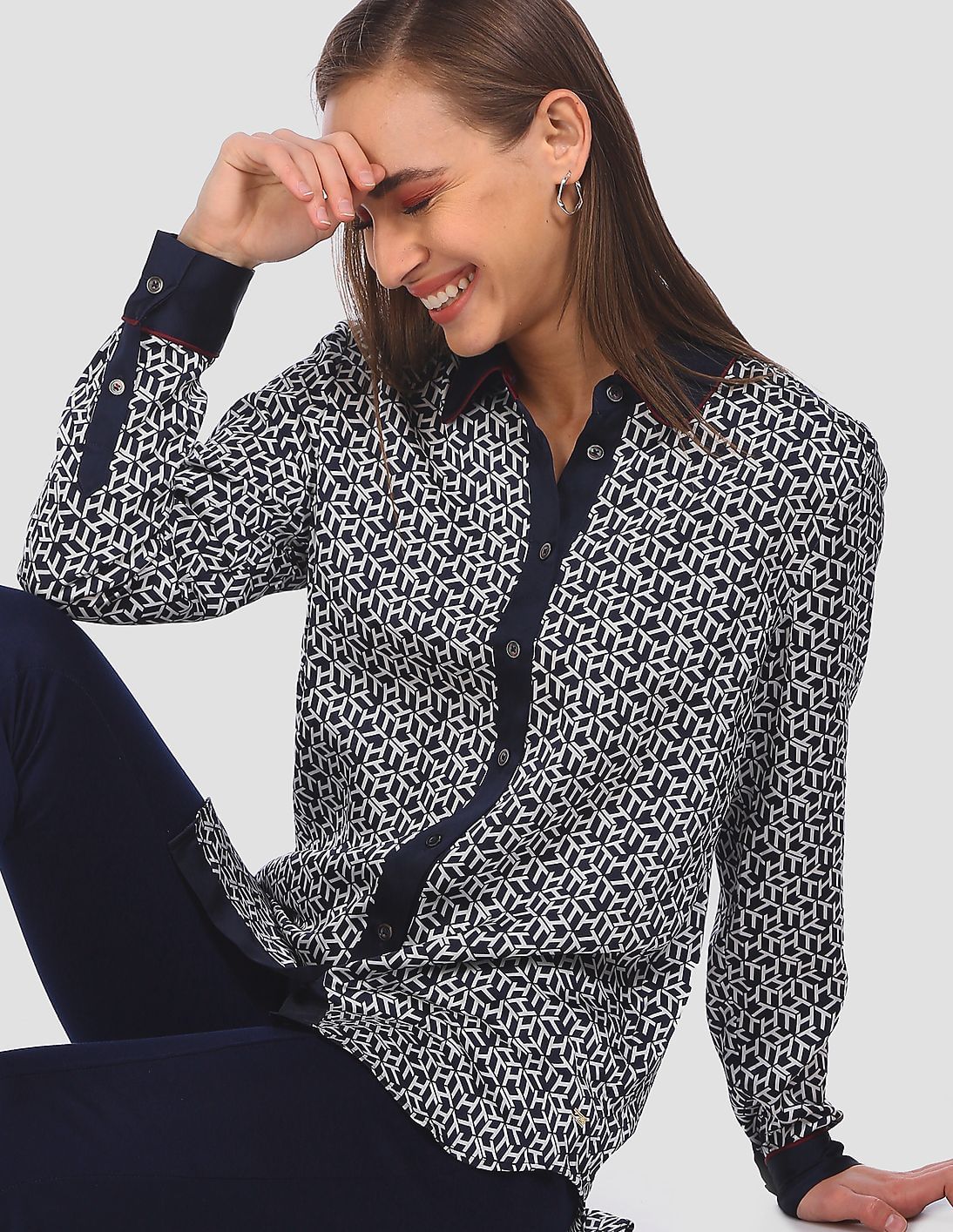 Women Navy And White Long Sleeve Logo Print Shirt