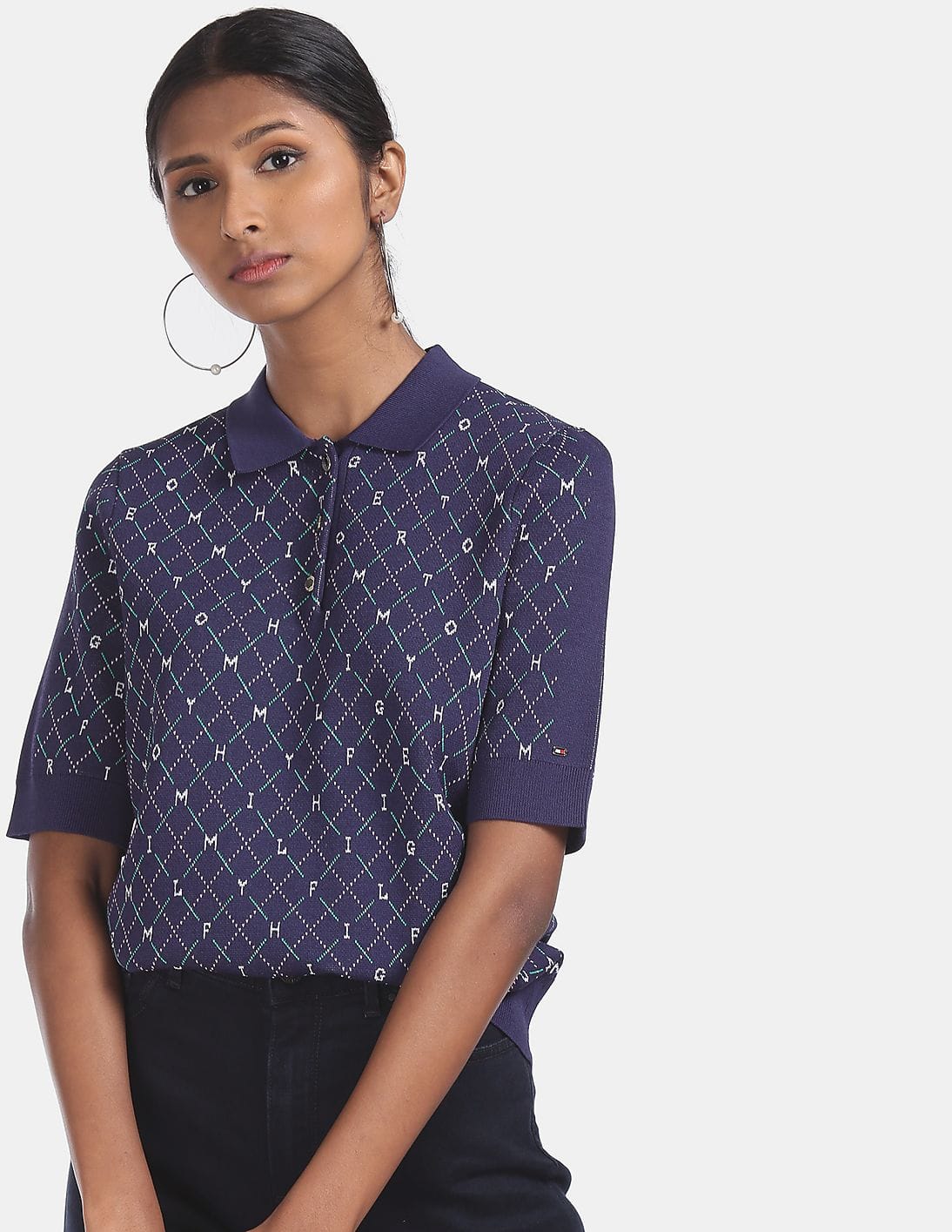 Women Navy Elbow Sleeve Brand Pattern Polo Shirt