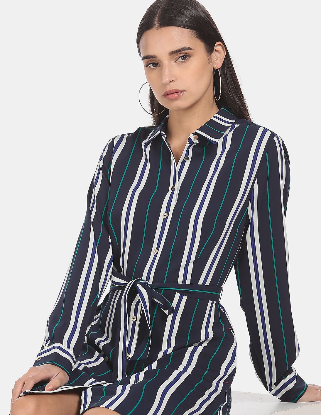 Women Navy Long Sleeve Viper Striped Shirt Dress