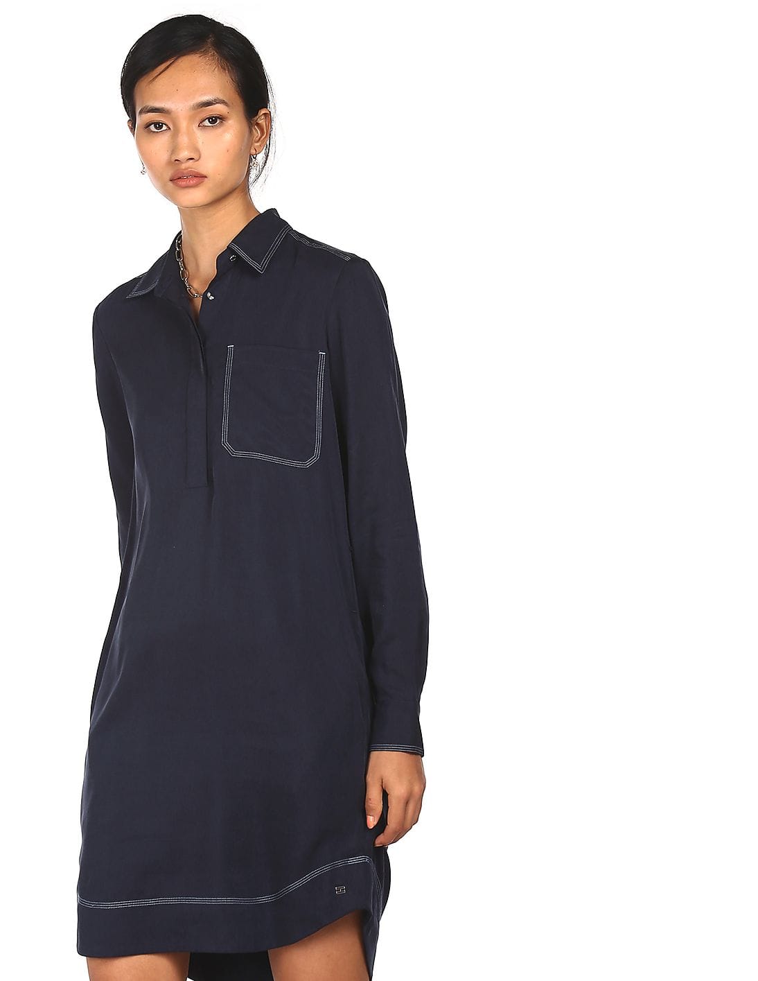 Women Navy Patch Pocket Shirt Dress