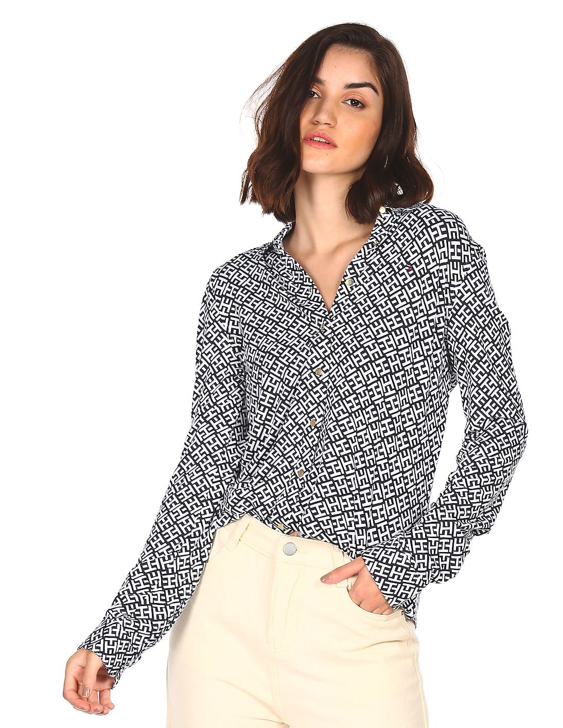 Women Navy Spread Collar Brand Monogram Print Shirt