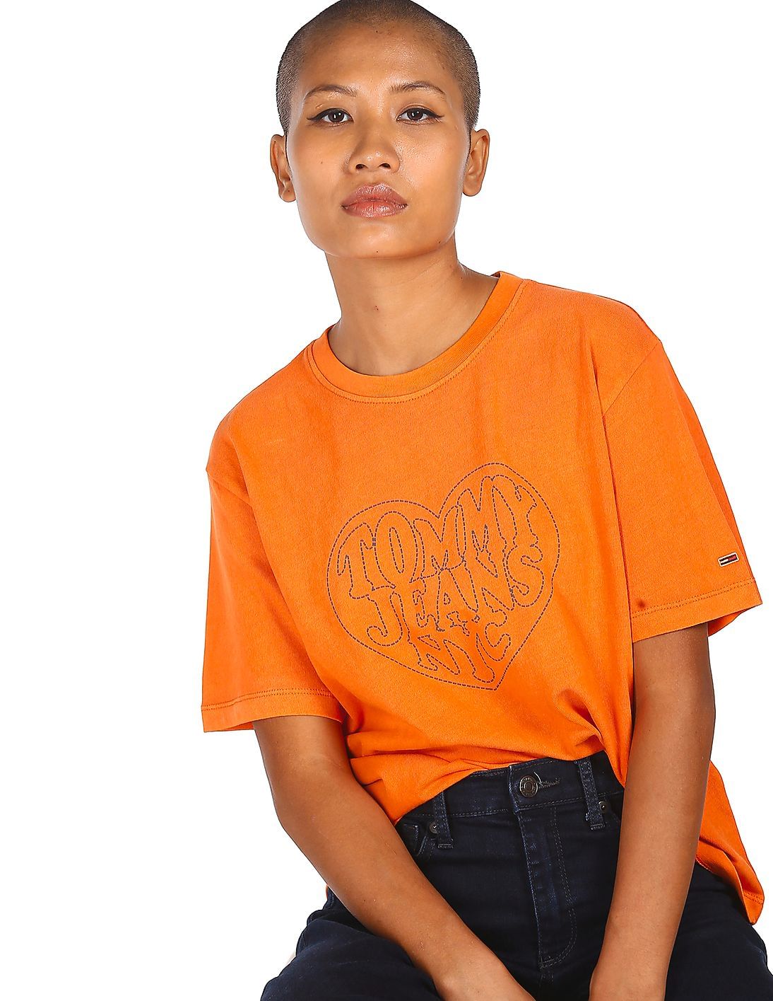 Women Orange Crew Neck Stitched Logo Boxy T-Shirt