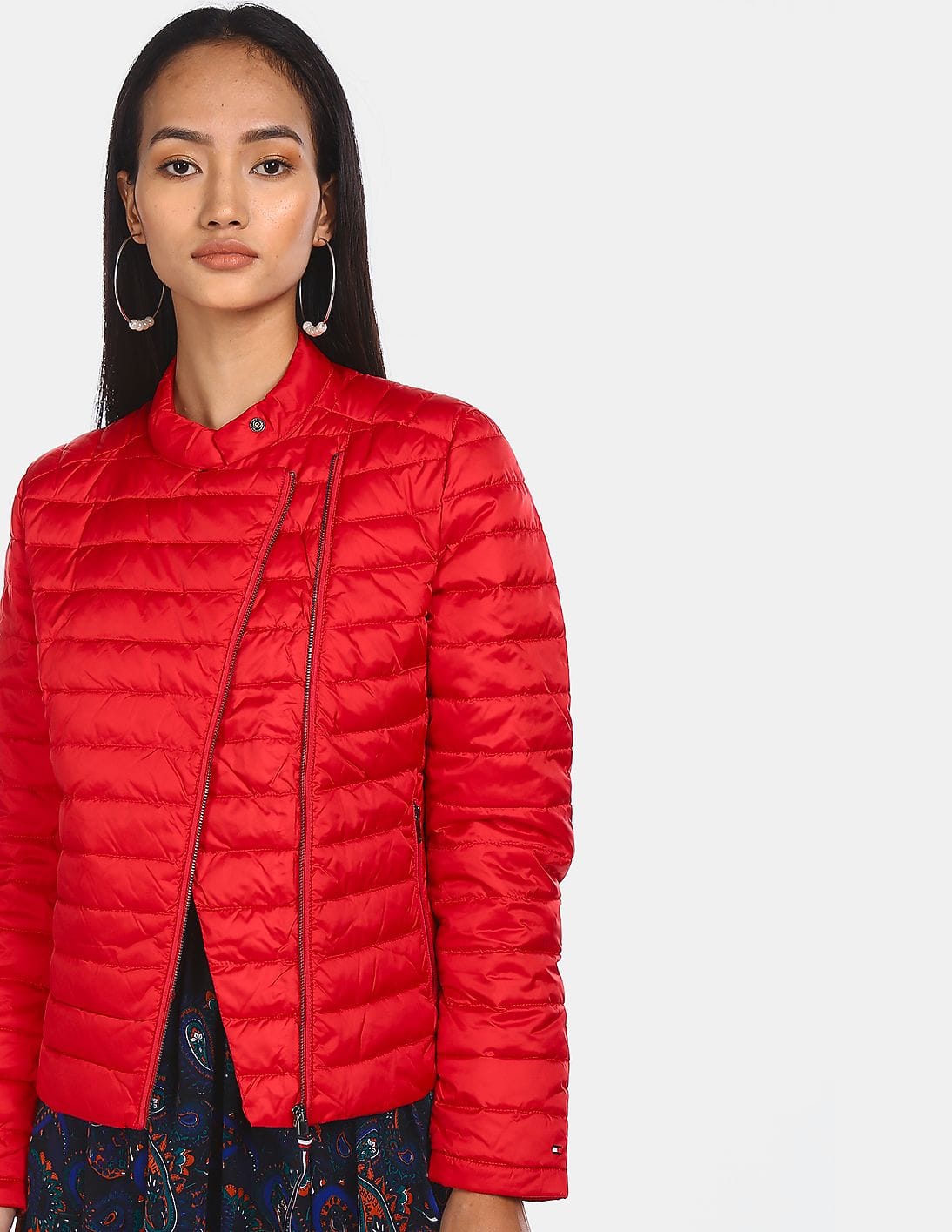 Women Red Asymmetric Zip Solid Quilted Biker Jacket