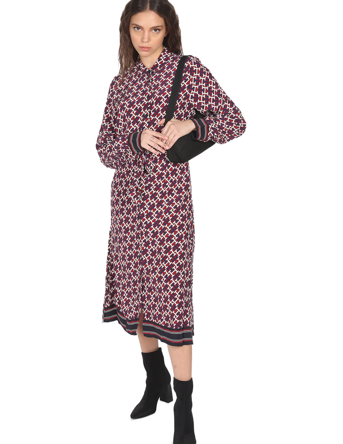 Women Red Viscose All Over Monogram Print Midi Shirt Dress