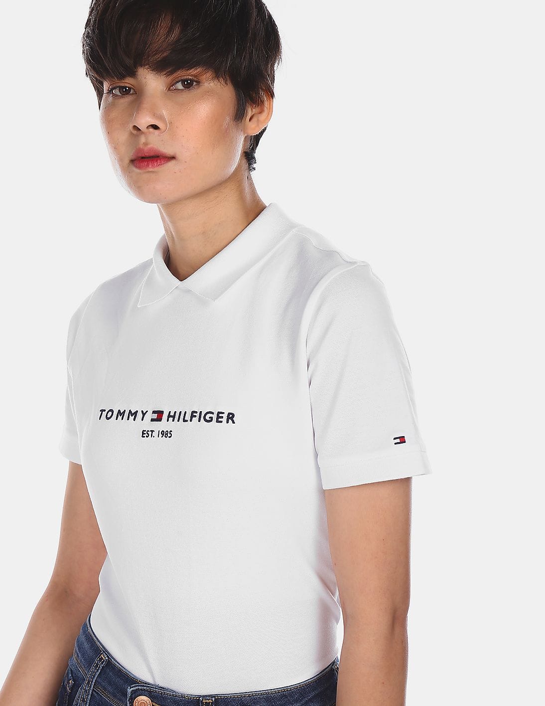 Women White Logo Embroidered Zipper Back Polo Shirt