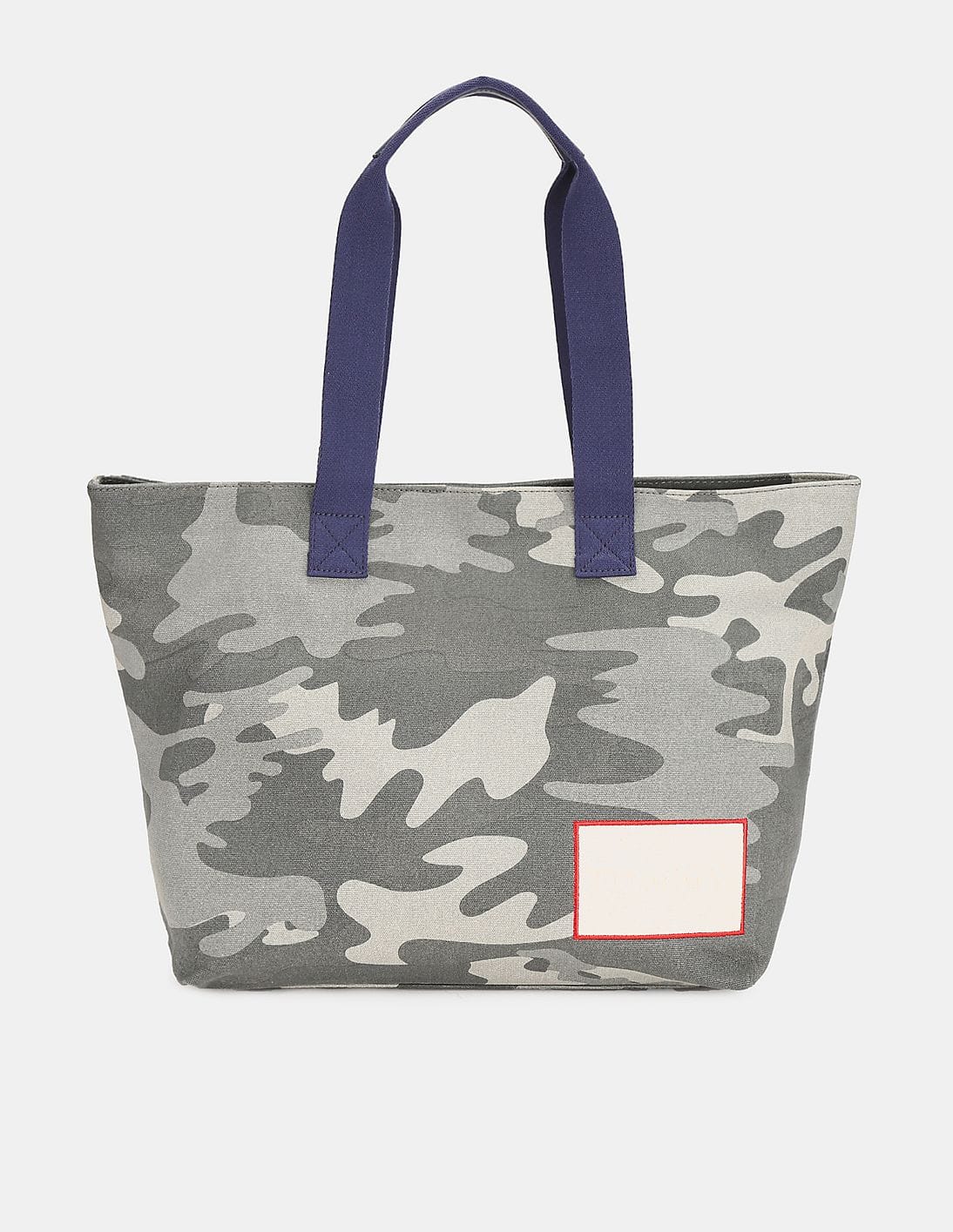 Women Grey Camo Print Cotton Tote Bag With Patch