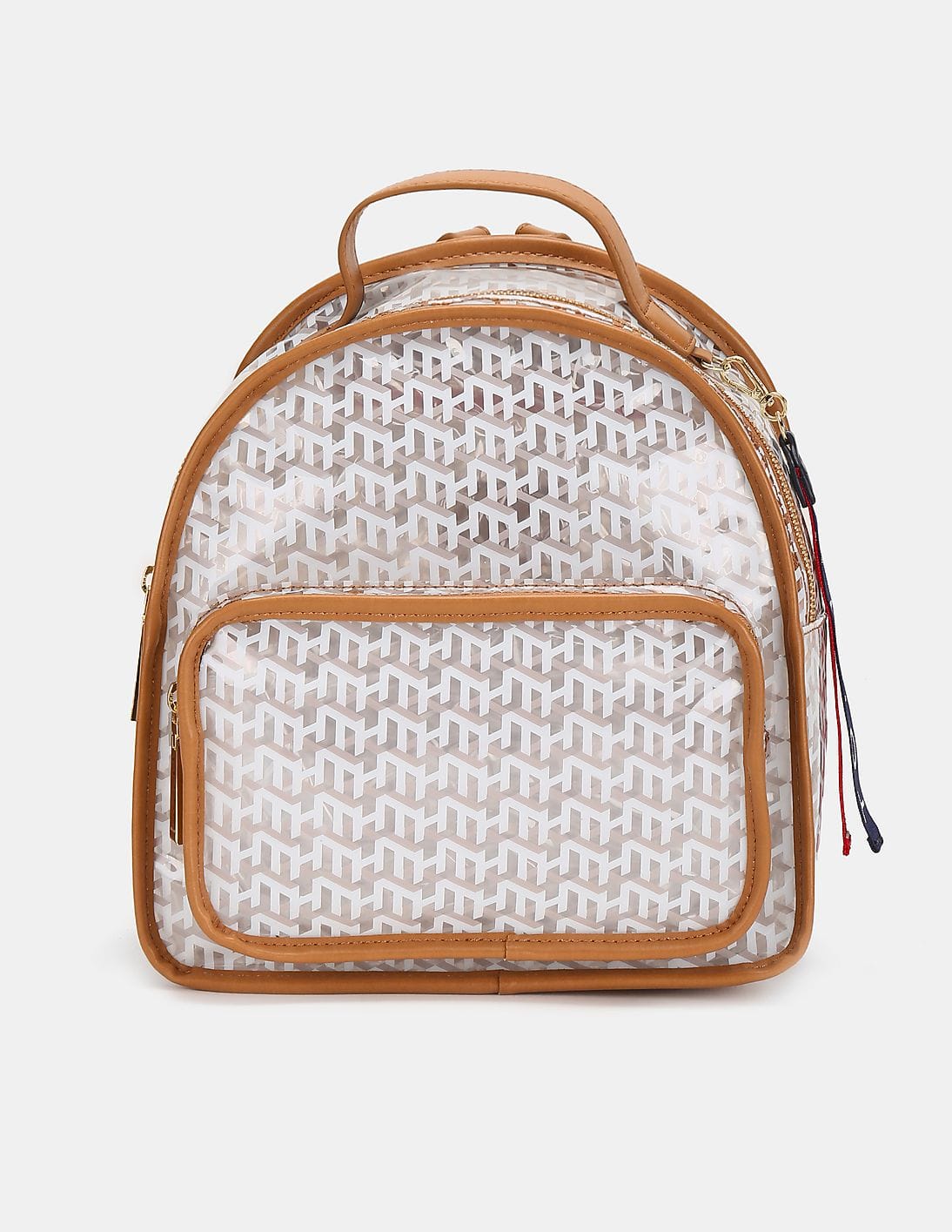 Women Off White And Tan Cube Clear Monogram Print Backpack
