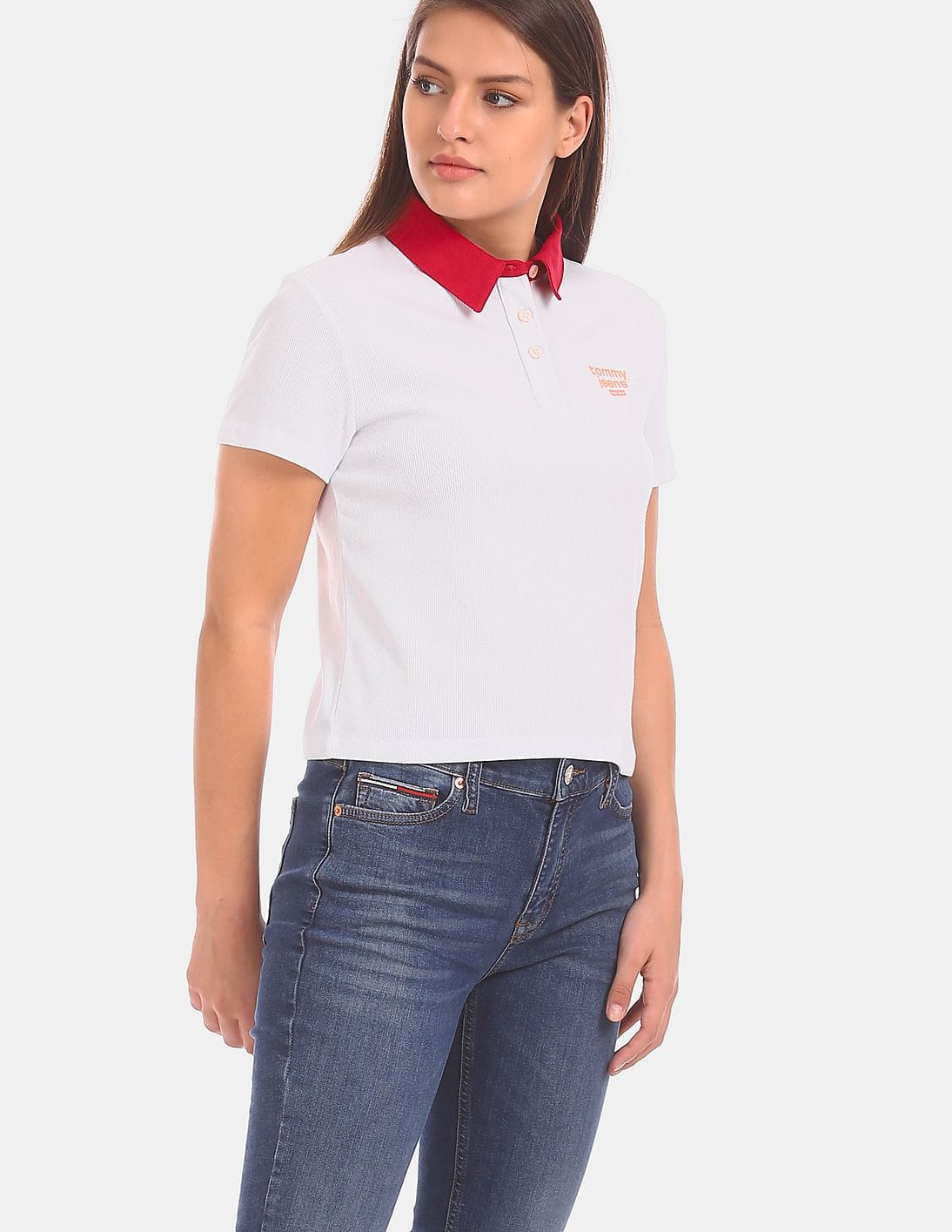 Women White Contrast Collar Short Sleeve Rib Knit Polo Shirt